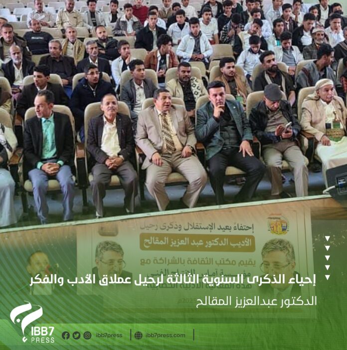 أقيمت في محافظة إب اليوم، فعالية خطابية وأدبية إحياء للذكرى السنوية الثالثة لرحيل عملاق الأدب والفكر العربي الدكتور عبدالعزيز المقالح، نظمها مكتب الثقافة بالمحافظة بالشراكة مع مؤسسة أماس للإنتاج الفني.